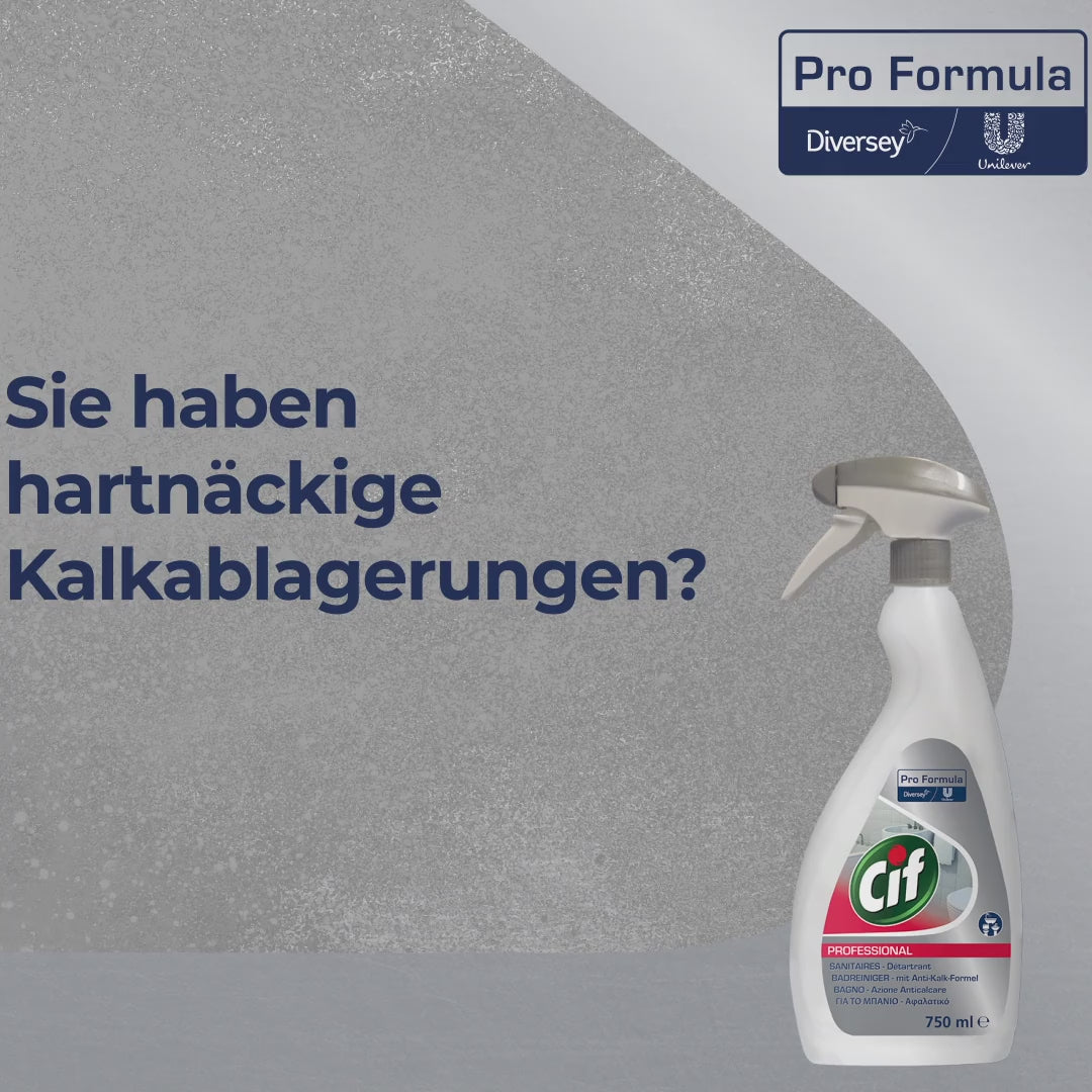 Eine 750 ml weiße Sprühflasche Cif Professional Badreiniger von Diversey Deutschland GmbH & Co. OHG, mit grauer Düse und Etikett, mit 2 in 1 Reinigen und Entkalken für effektive Kalk- und Badreinigerwirkung.