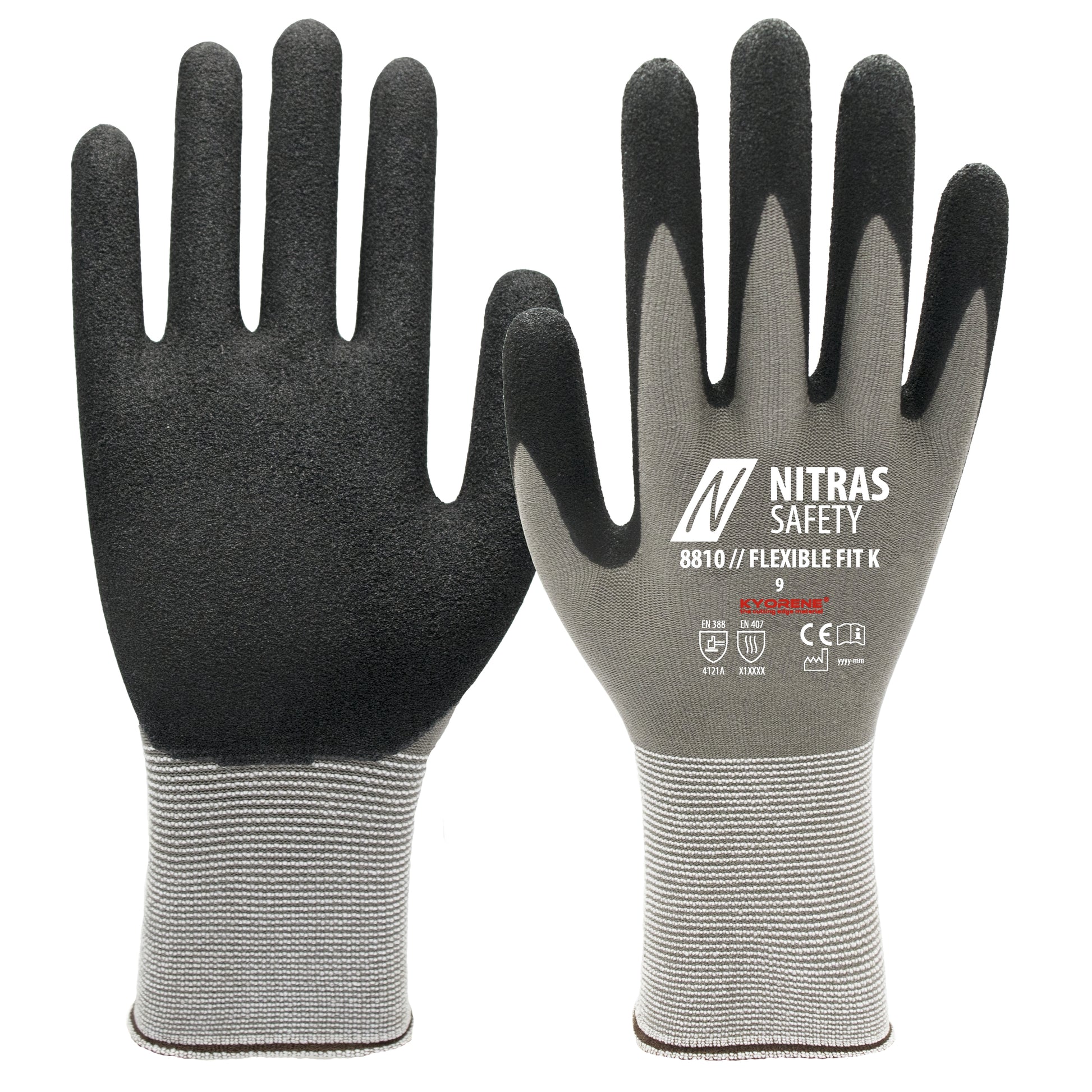 The NITRAS FLEXIBLE FIT K assembly gloves are the ideal choice for anyone who values the highest quality and safety. Made from high-quality KYORENE® special yarn, these gloves not only offer protection against contact heat up to 100° C for 15 seconds, but also exceptional comfort and perfect dexterity. The nitrile foam coating in black (color code: 1210) ensures excellent grip and slip resistance, while the partially coated palm and fingertips increase abrasion resistance. Certified according to OEKO-TEX STANDARD 100®, these gloves represent first-class quality and safety in PPE risk category II.